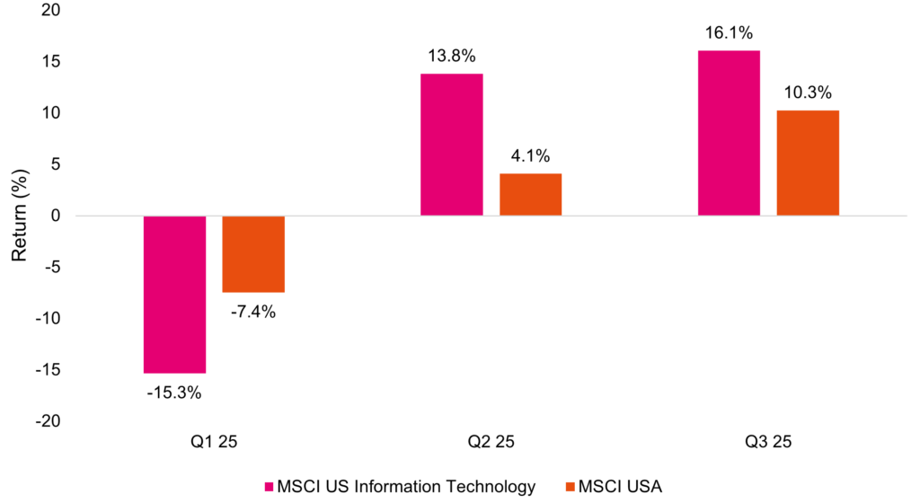 The ability to invest billions of dollars in projects with uncertain returns has been made possible only by the exceptional financial strength of leading U.S. technology companies. Simply put, few firms have the scale or resilience to take such risks. In today’s market – where investors are rewarding companies viewed as enablers and beneficiaries of the emerging AI economy – this dynamic has led to a renewed period of narrow leadership, with a small group of companies driving the majority of returns.
